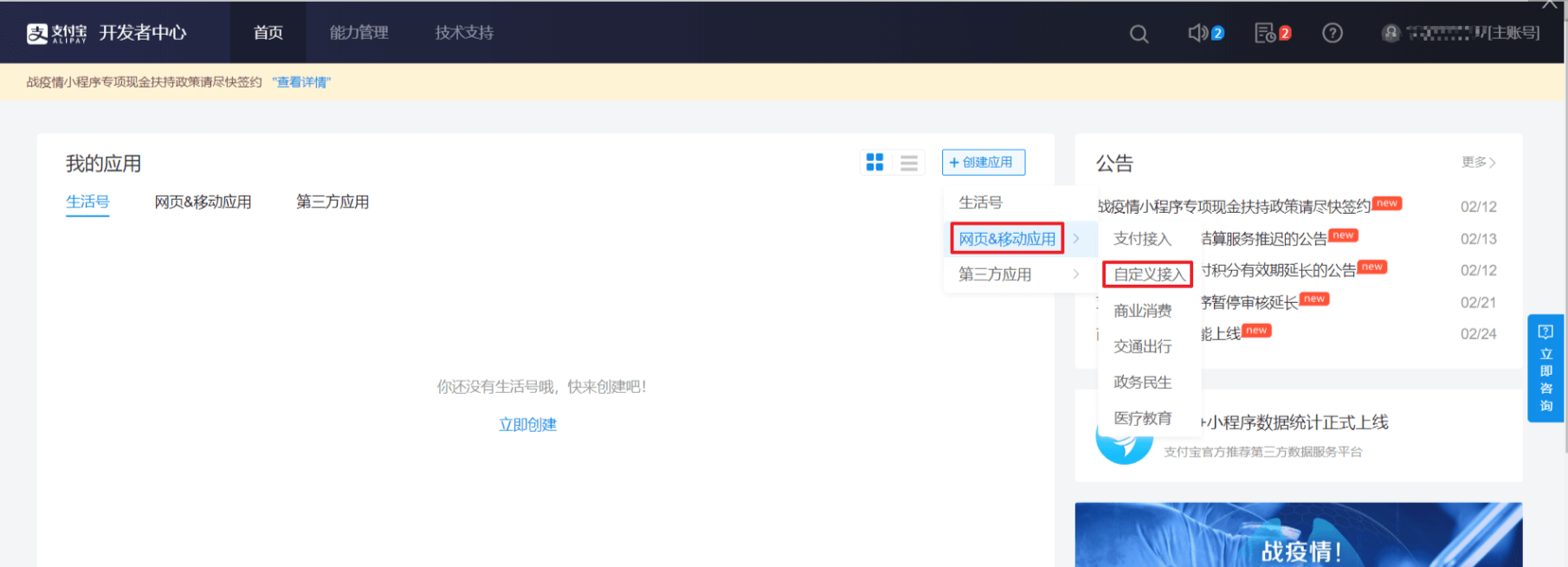 点击创建应用,选择网页&移动应用标签下的自定义接入