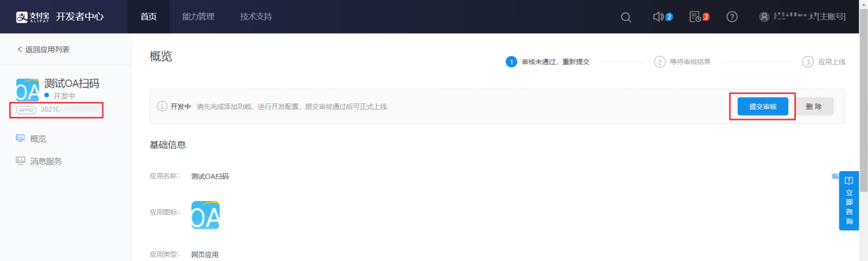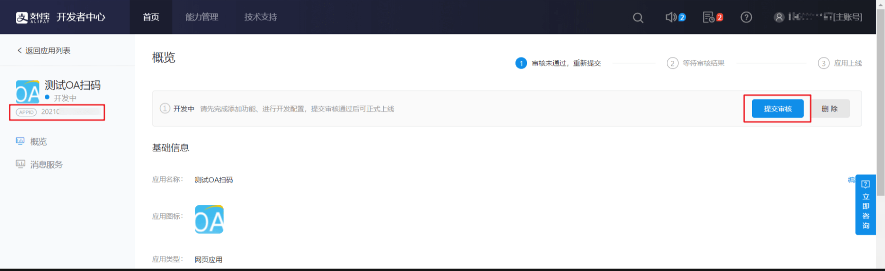 获取应用的APPID参数保存到本地,并提交审核说明 使用支付宝扫码登录功能,必须确保支付宝开放平台的应用已通过审核