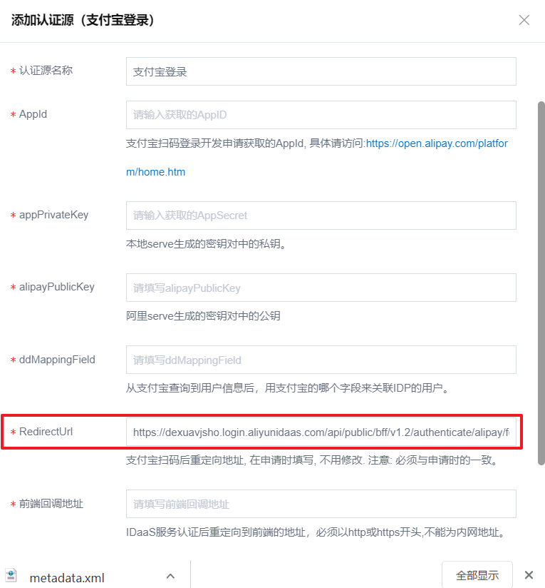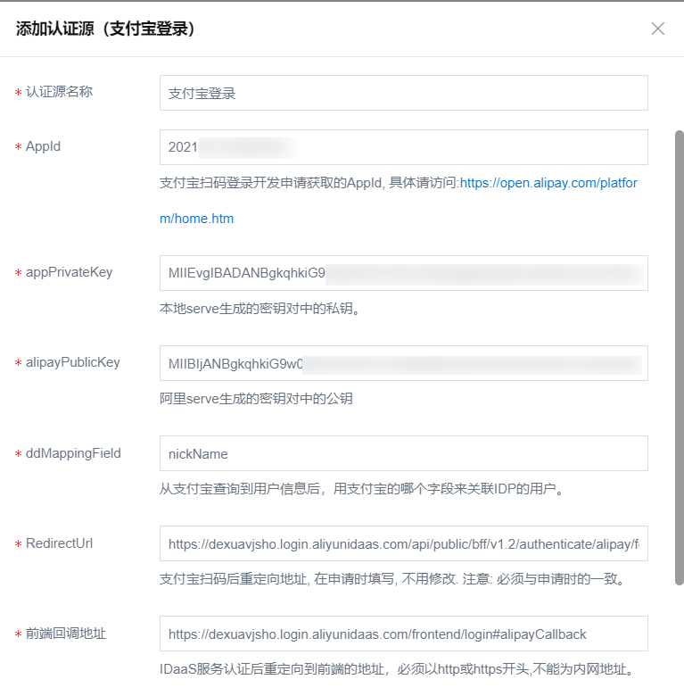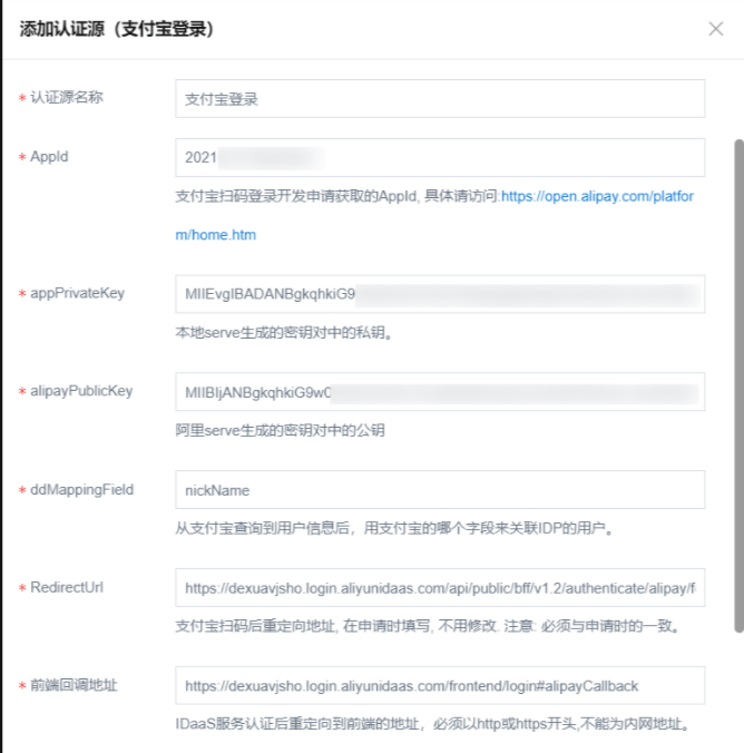 其中:AppId、appPrivateKey、alipayPublicKey为上述过程中获取的支付宝应用参数ddMappingField:nickName前端回调地址:IDaaS域名地址+/frontend/login#alipayCallback是否显示:勾选之后,会在登录页面展示支付宝认证源