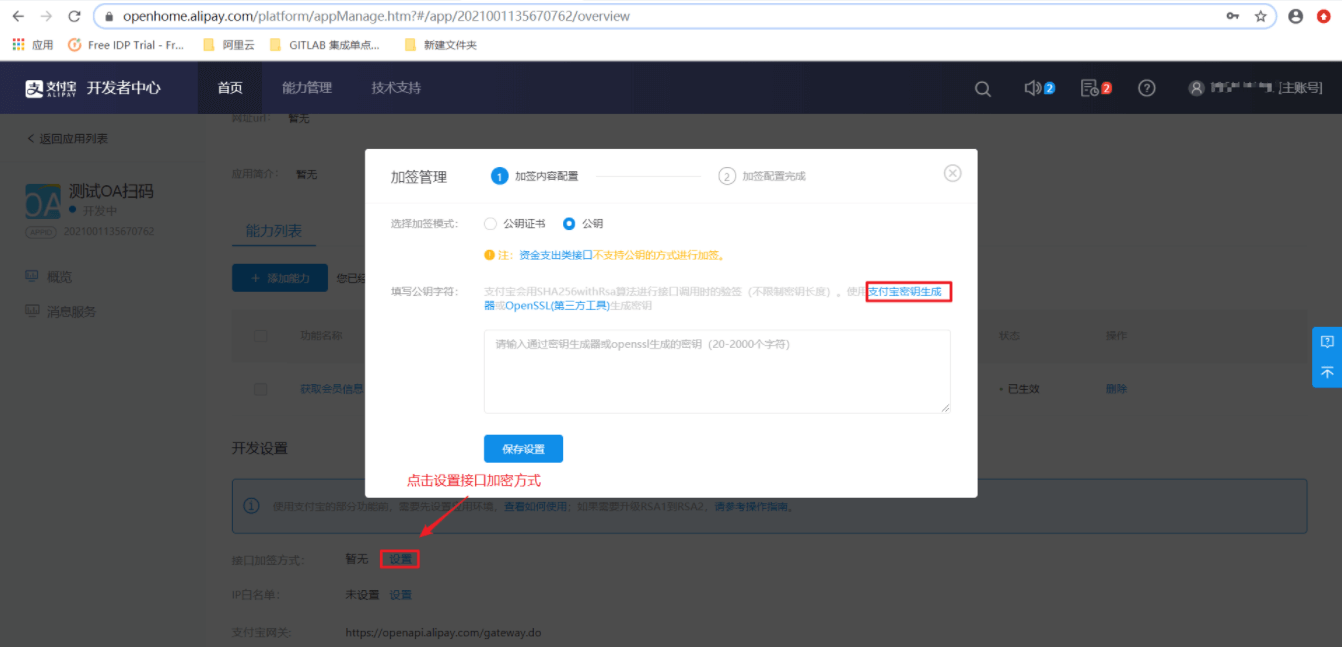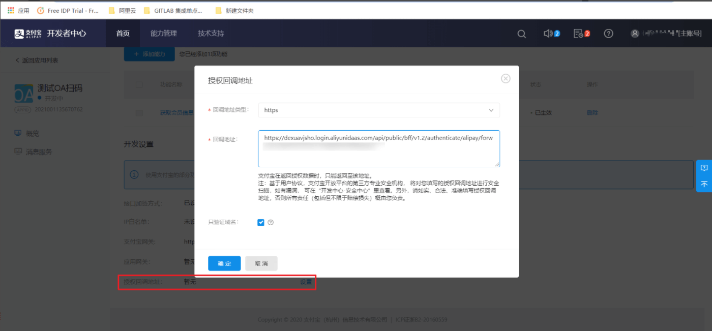 将自动生成的RedirectUrl填写到支付宝创建的应用的授权回调地址中