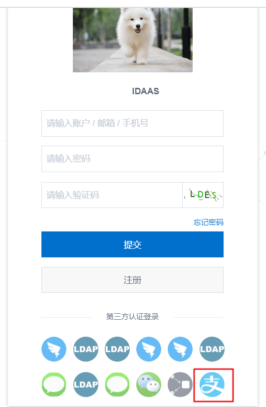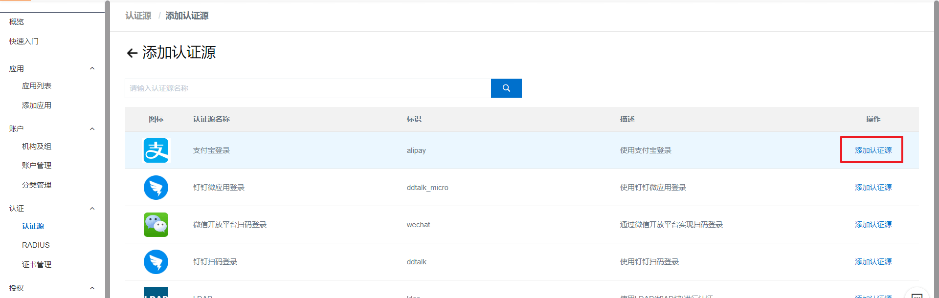 点击右上角添加认证源,选择支付宝登录,点击添加认证源。