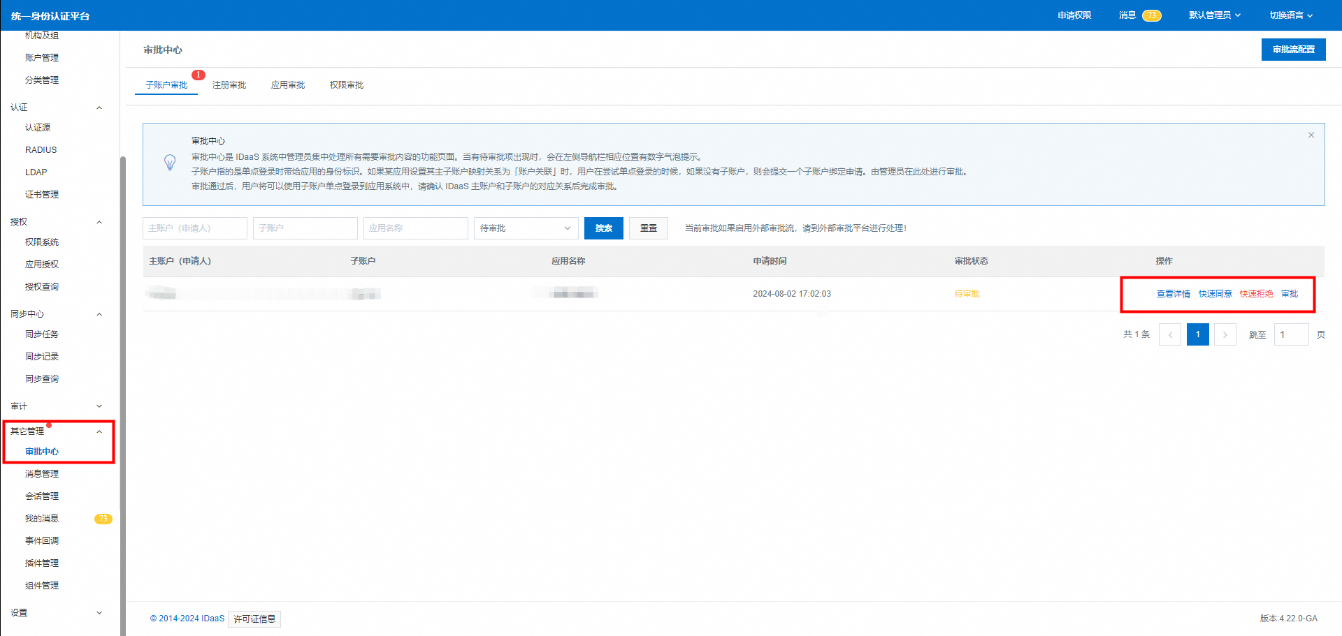 登录IDaaS管理员端,进入其他管理>审批中心,对关联申请进行审批