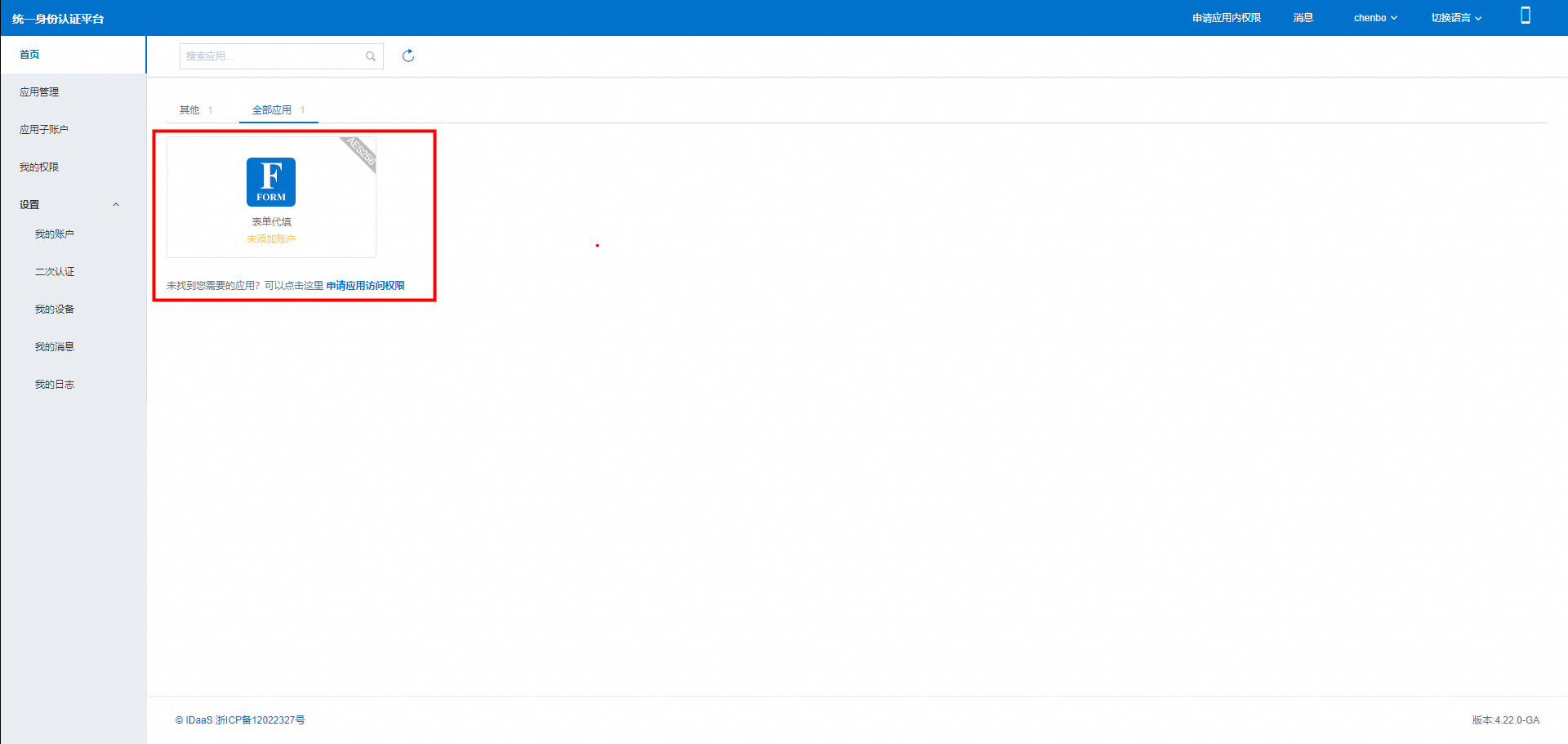 在左侧导航栏,单击应用 > 添加应用,选择表单代填应用模板点击添加应用