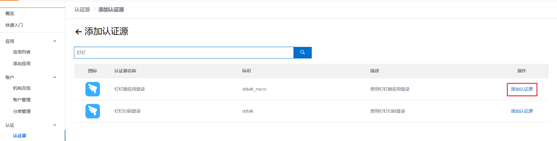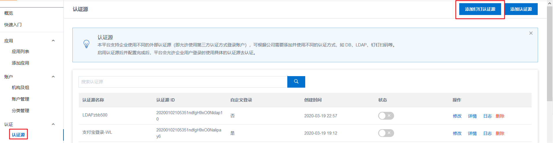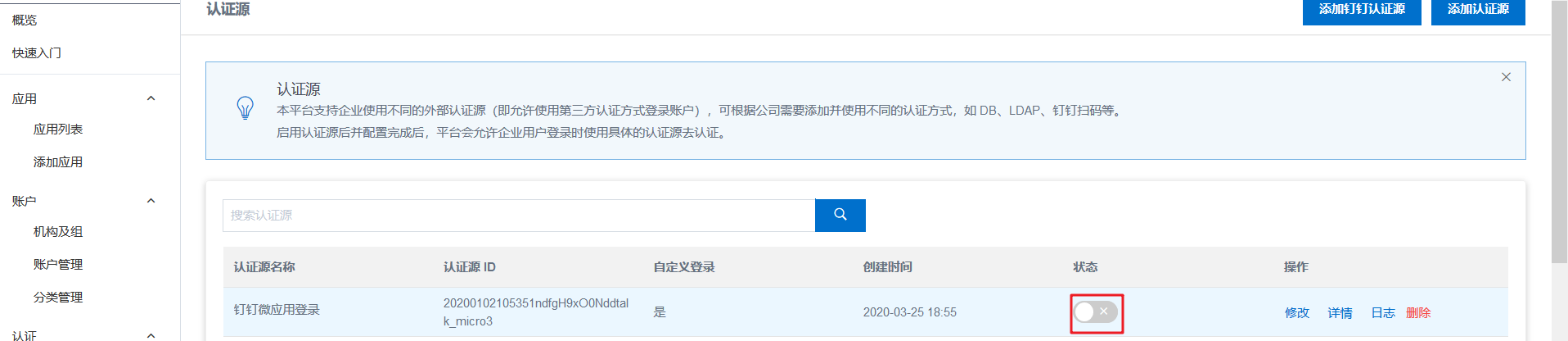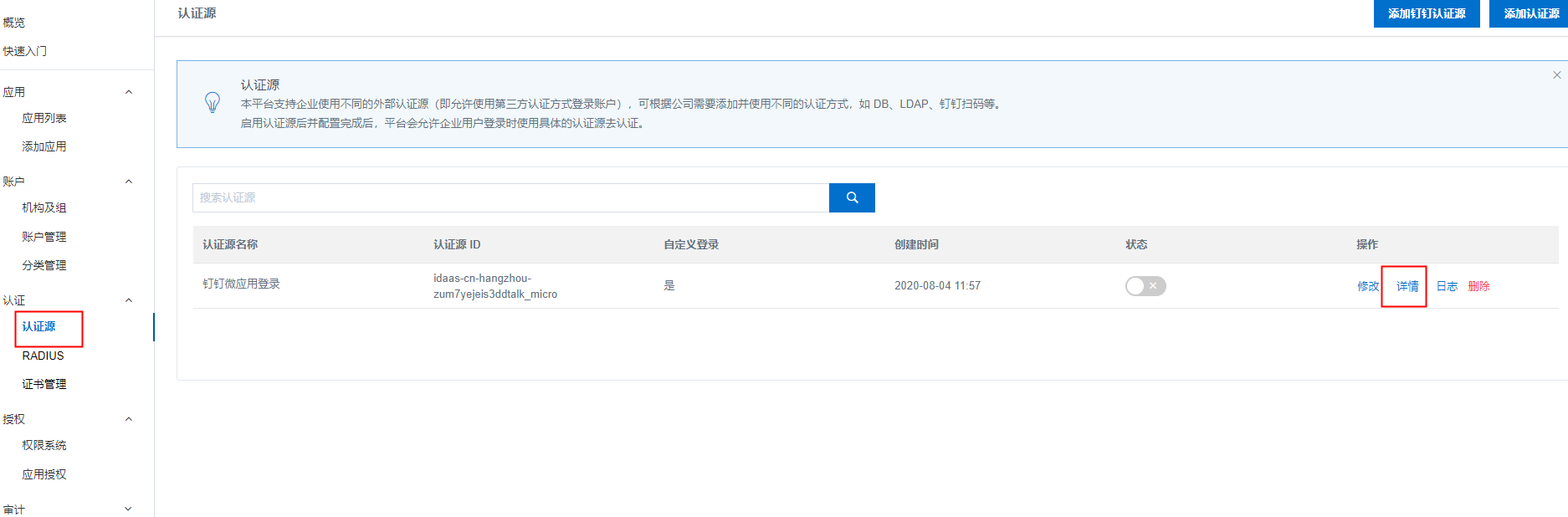 4.1. 在IDaaS管理员页面,点击认证源 - 点击钉钉微应用登录的详情。