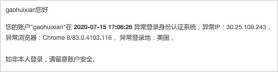 账号异常会发送异常告警信息,通知用户。用户接收方式,可以选择邮件或者短信。
