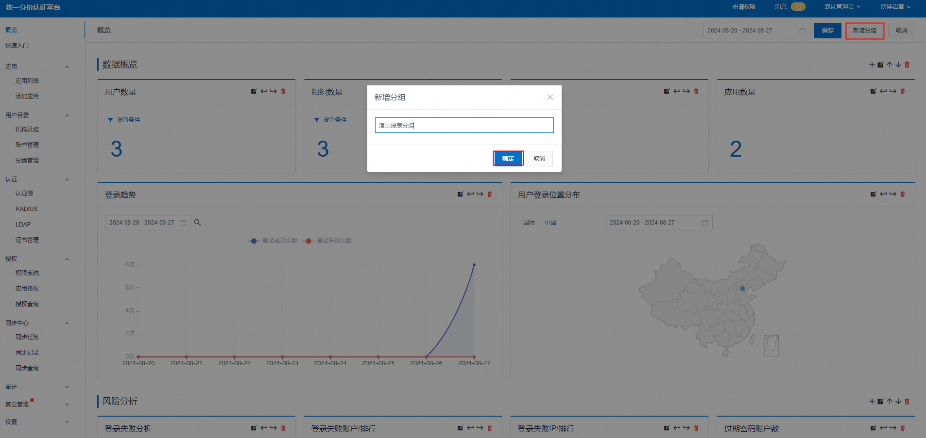 2.在界面上点击’新增分组’,在弹框中输入自定义报表的分组名称,点击’确定’创建新的分组。