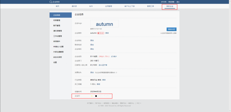 企业ID:企业 CropId,在企业微信后台“我的企业”详细中可获取。
