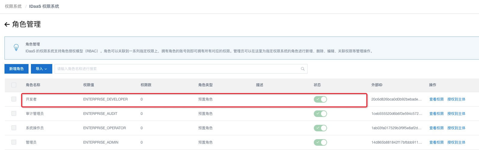 在IDP系统的默认权限系统中,预置了一个默认的开发者角色。