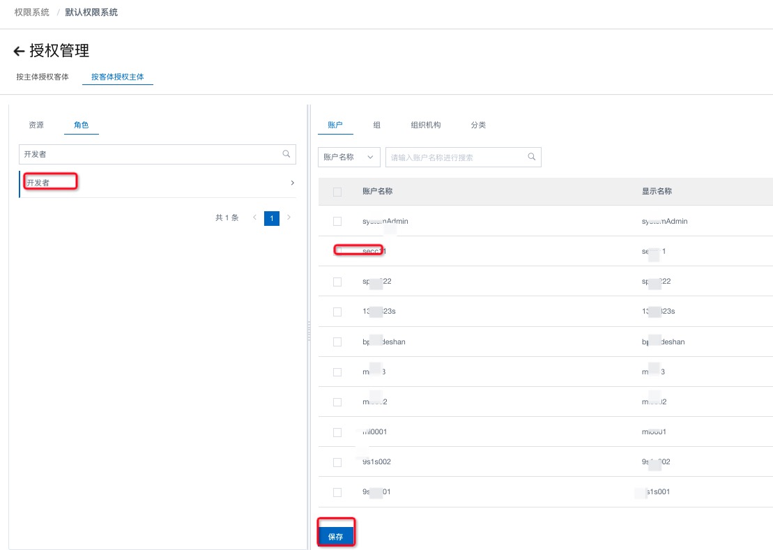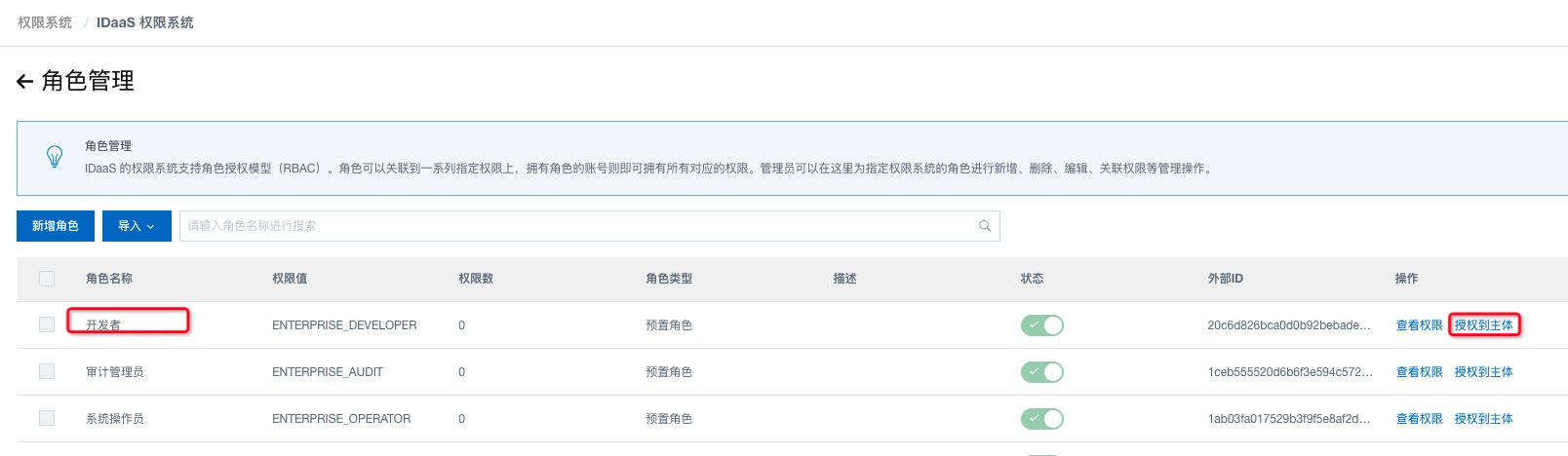 3.在’开发者’角色一行操作栏中点击’授权到主体’,将上一步创建的账户进行授权即可(记得点击’保存’按钮)。