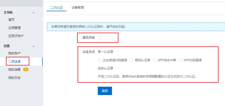 登录成功后依次进入:设置->二次认证,在’是否开启’ 选项勾上/取消勾上即可开启/关闭二次认证,记得点击’保存’按钮。