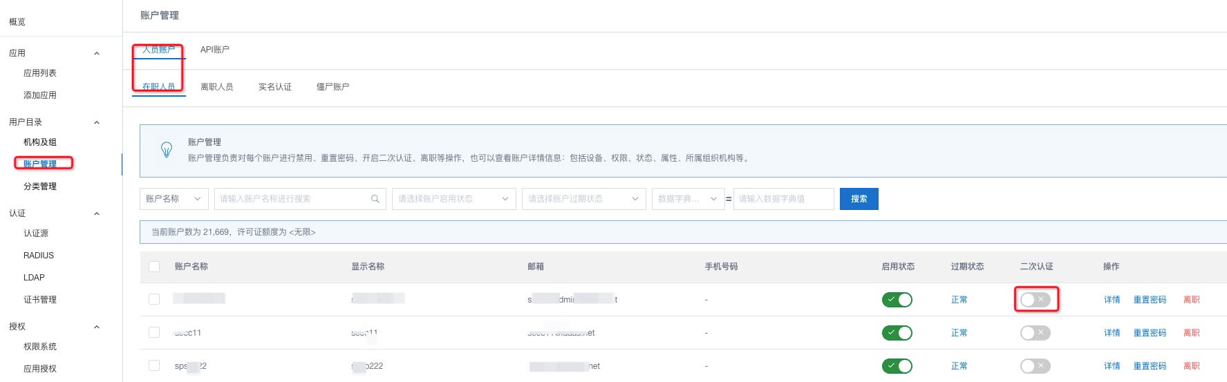 登录后依次进入:账户管理->人员账户->在职人员,在’二次认证’列上点击可开启/关闭对应账户的二次认证。如下图: