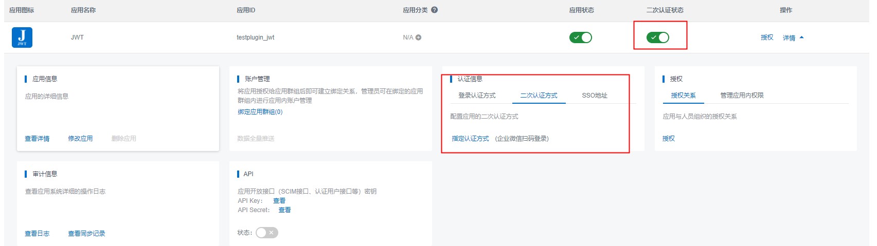 登录后点击:应用列表,在需要设置的应用’二次认证’列上点击可开启/关闭对应二次认证。如下图: