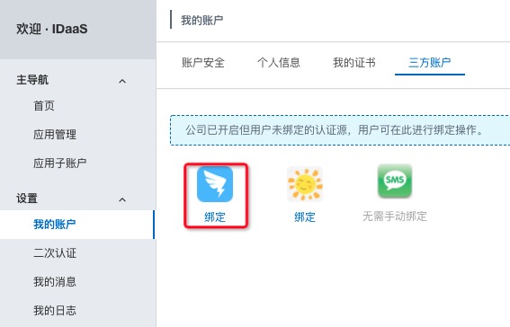 以普通账户登录系统,依次进入:我的账户->三方账户,在这里能看到已经绑定的三方账户或需要绑定的三方账户。如下图: