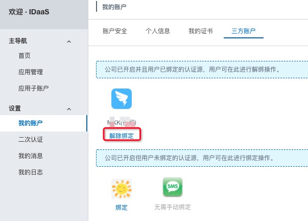 注意:只有IT管理员在认证源中开启了第三方账户认证(如钉钉扫码登录,微信扫码登录)才需要绑定/解绑操作。