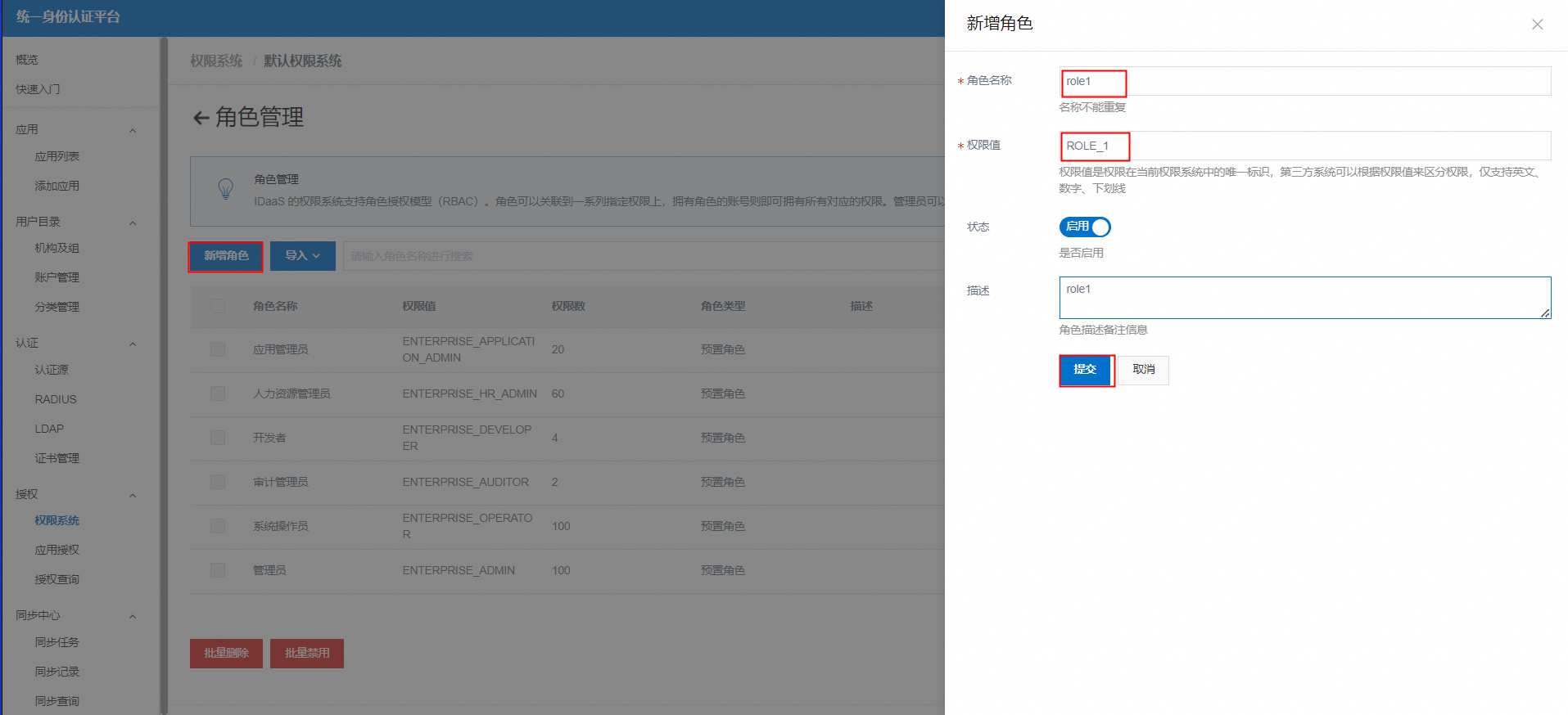 2.在界面上点击’新增角色’,在弹框中输入自定义的角色名称与权限值等,点击’提交’创建新的角色。