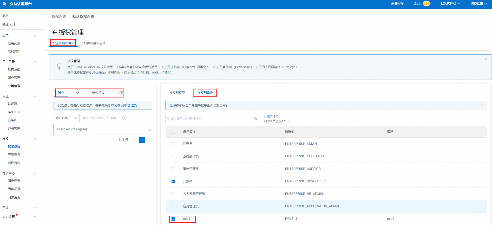 方式一:如上图所示,在角色的操作栏点击’授权到主体’,进去后可将指定的角色关联到具体的账户或组织机构等。